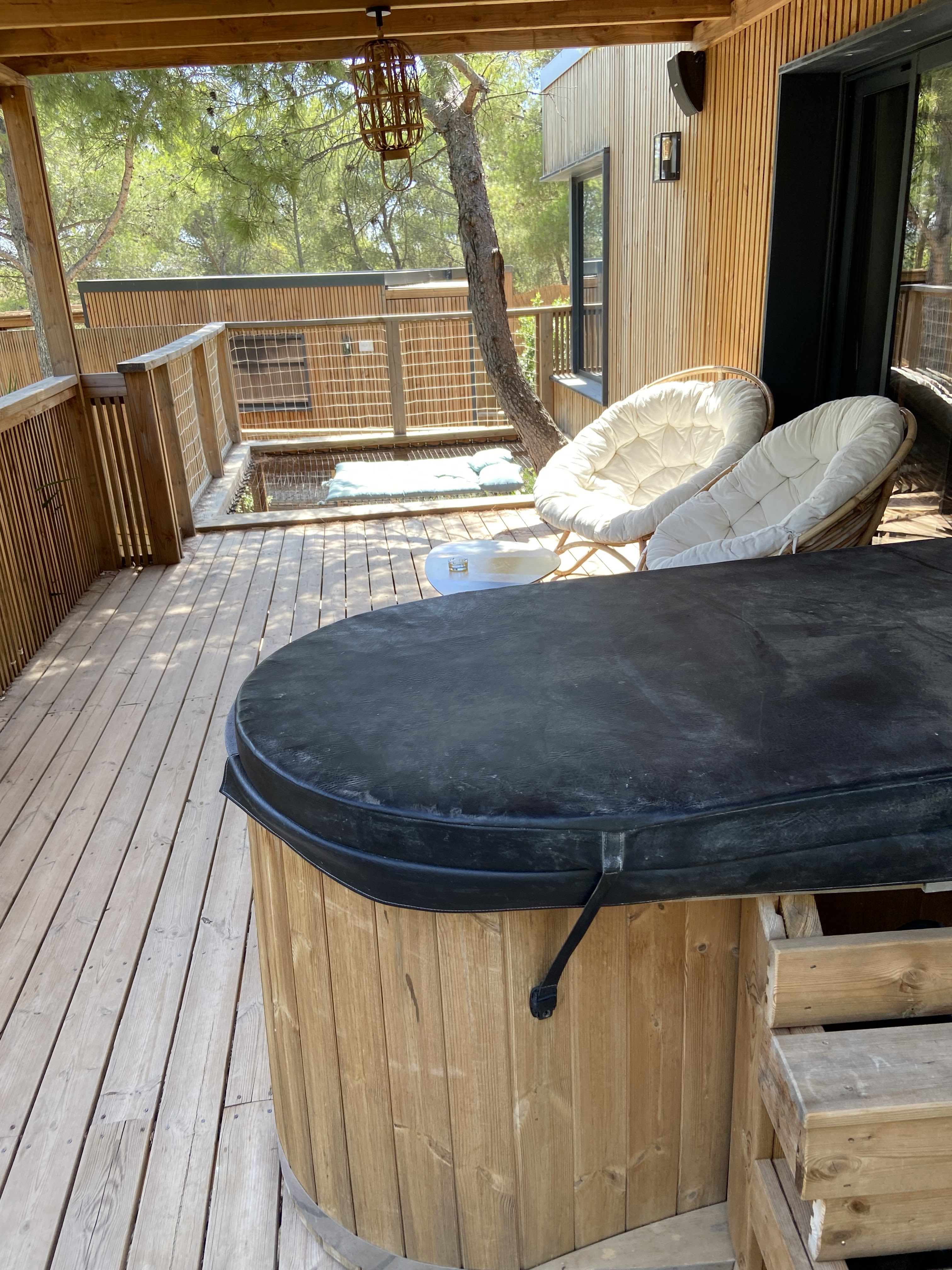Chambre Cocoon n.9 un dimanche soir hors vacances = chambre avec un jacuzzi privatif extérieur sur terrasse. Trop de proximité avec les autres hébergements et trop de passages des voiturettes électriques. C’est un camping nouvelle génération pas un hôtel 5 étoiles. Au moment du séjour, le réparateur a installé les lampions et le jacuzzi du cocoon n.7 : aucune intimité ! Très déçue par les lieux. SPA en extérieur donc pas adapté pour la saison froide.